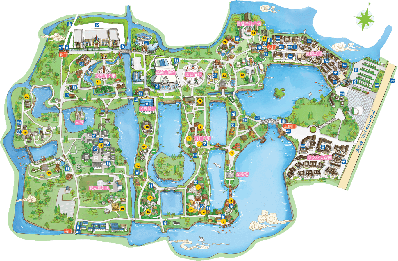 彝族在云南境內約471萬人,是省內人口最多、分布最廣的少數民族,主要聚居在金沙江、元江流域和哀牢山、無量山腹地。彝族是一個能歌善舞的民族,民間打歌、跳樂之風盛行,大三弦、跌腳舞久負盛名。火把節(jié)是彝族最具特色的民族節(jié)日。彝族村占地50余畝,三虎浮雕墻與虎頭內祖師形象表現了彝族虎鷹文化。太陽歷廣場圖騰柱上有太陽、虎、火和八卦圖形象,周圍環(huán)繞著10個朝向不同的月球造型,外圓周有12生肖石雕。依山而建的“...